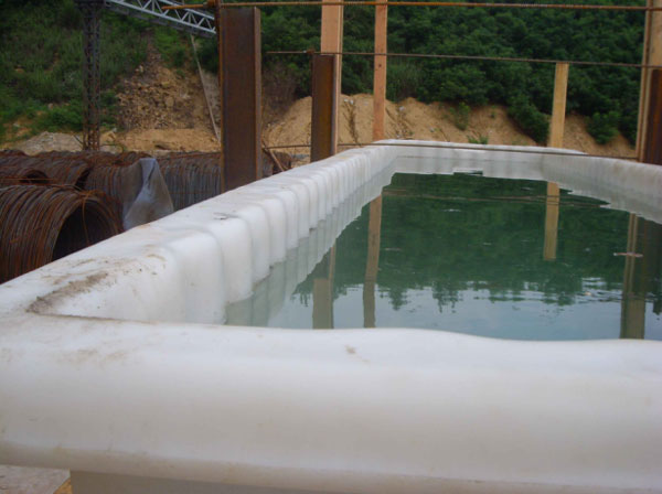 将符合图纸标号要求的混凝土浇入支撑好的模具内,用震动棒捣固密实。凝固后拆模、养护(养护期为28天)、混凝土表面沥青漆防腐。